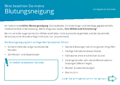 HämophilieAufklärungskarte Von-Willebrand-ErkrankungDownload als PDFDiese Karte informiert Ärzte/Ärztinnen über Ihre Diagnose und bietet grundlegende Informationen zum Von-Willebrand-Syndrom.